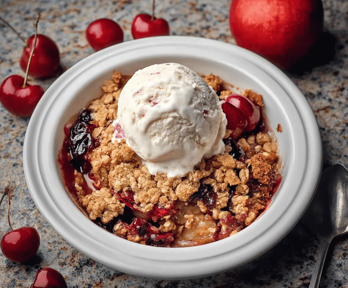 Enjoy the delightful contrast of tart cherries, tender apples, and crunchy oat topping! 🍏🍒