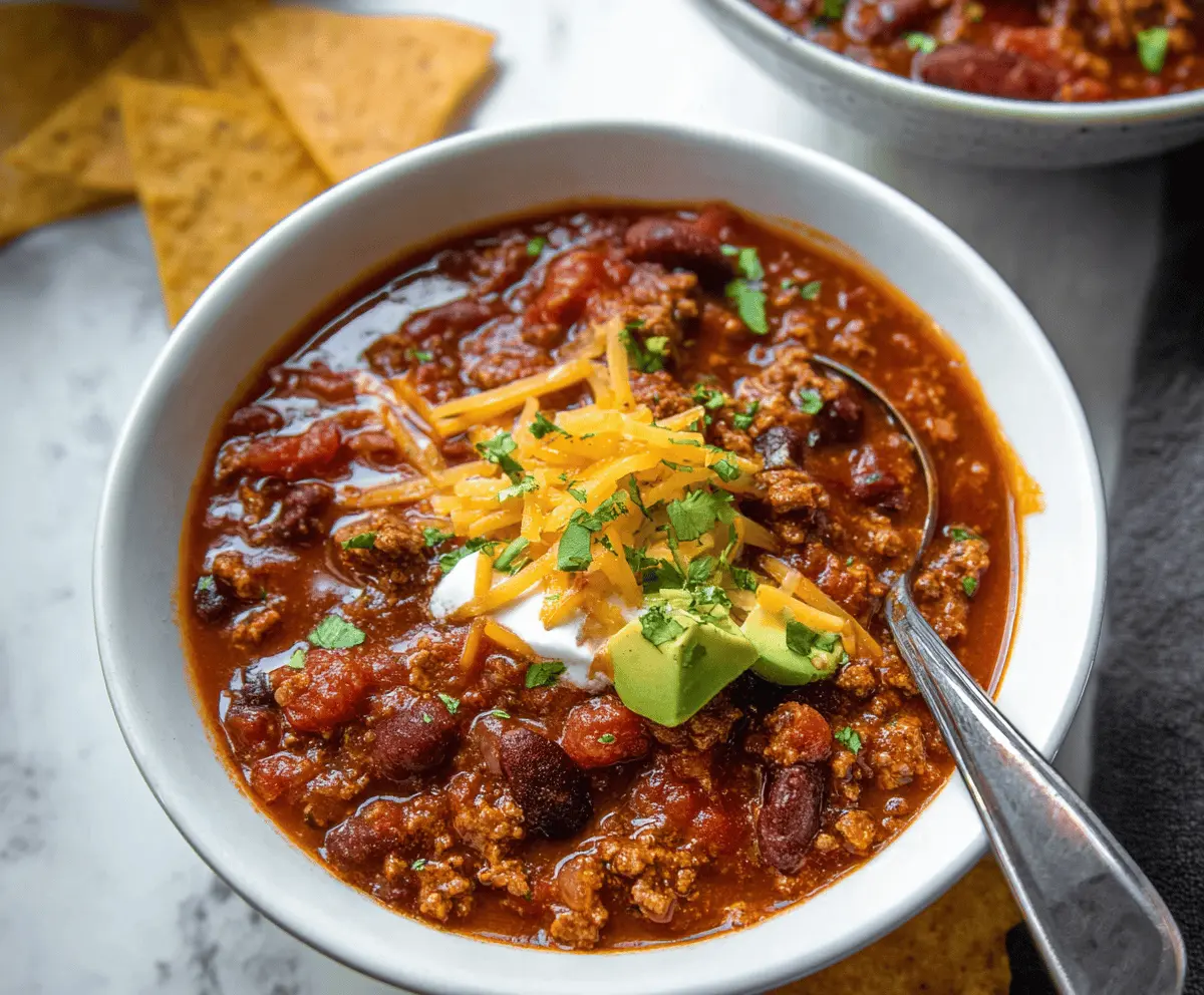 Serve the chili hot in bowls. Top it with your favorite garnishes like shredded cheddar cheese, green onions, red onions, and diced avocado for a fresh touch.