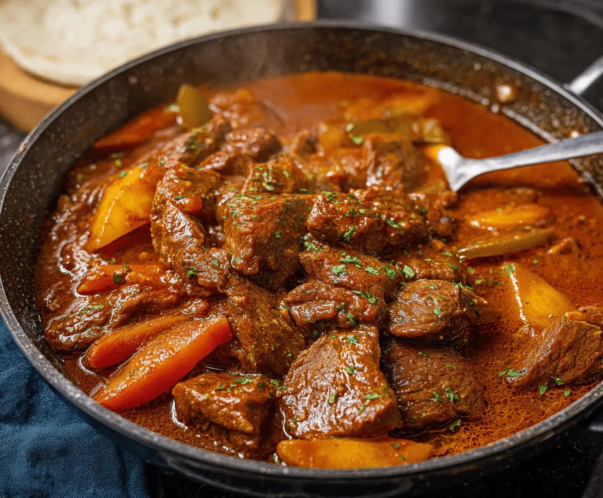 Delicious homemade Carne Guisada featuring tender beef stew with savory gravy, vegetables, and spices served in a rustic bowl