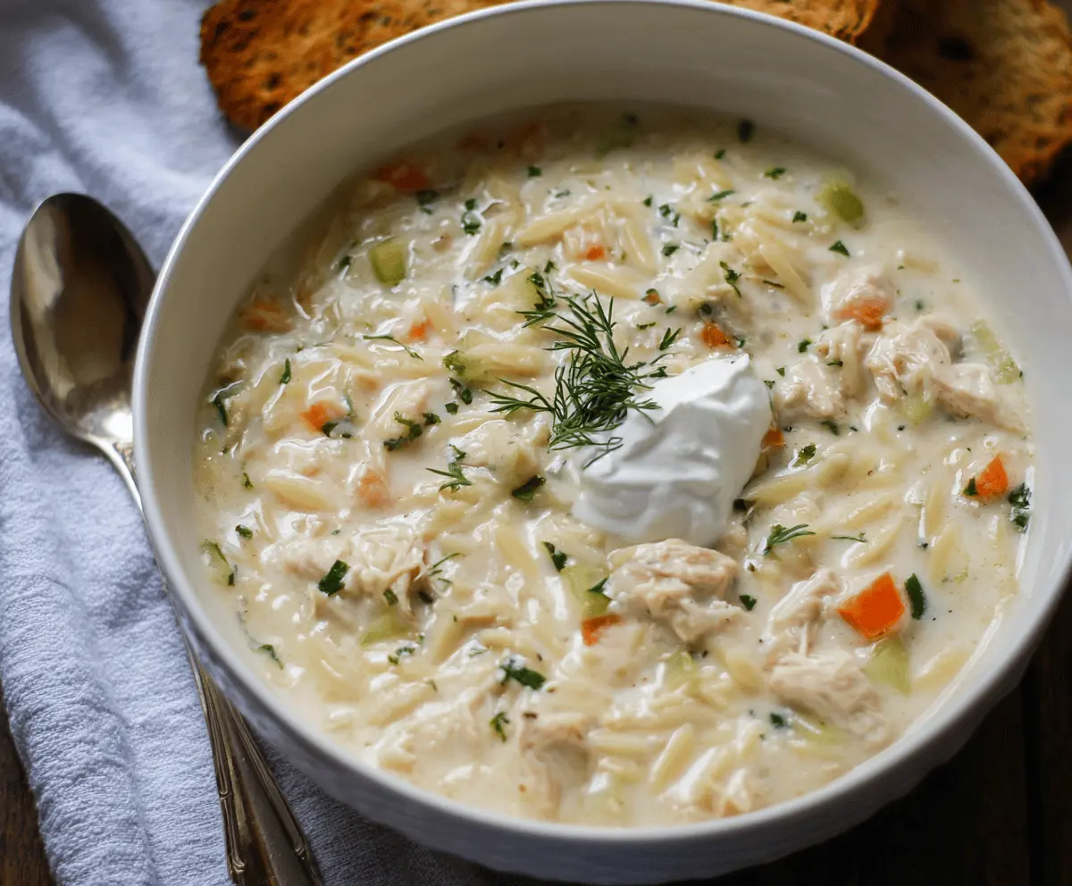Serve your creamy chicken orzo soup hot. Top each bowl with an optional dollop of sour cream or Greek yogurt and enjoy with some crusty bread on the side. Perfect for a cozy meal!