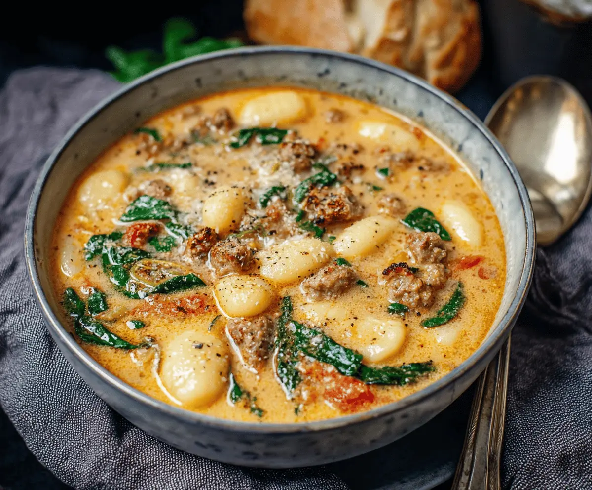 Creamy Italian Sausage Gnocchi Soup with spinach and herbs in a bowl, served hot and ready to enjoy