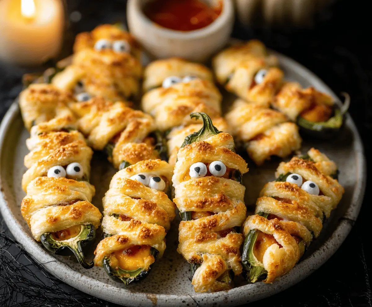 These spooky Mummy Jalapeño Poppers are a fun and tasty treat! Stuffed with cream cheese and wrapped in crescent dough, they make a perfect party snack for Halloween.