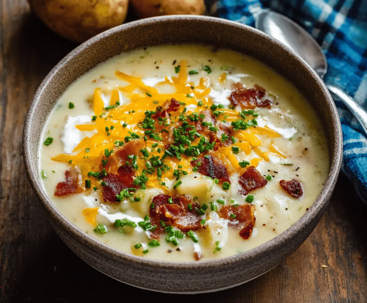 Yes, you can easily make a vegan version! Substitute the bacon with plant-based bacon, use vegetable broth instead of chicken broth, and swap dairy milk with a non-dairy alternative like almond or oat milk. Use dairy-free cheese and sour cream to keep it creamy and delicious!