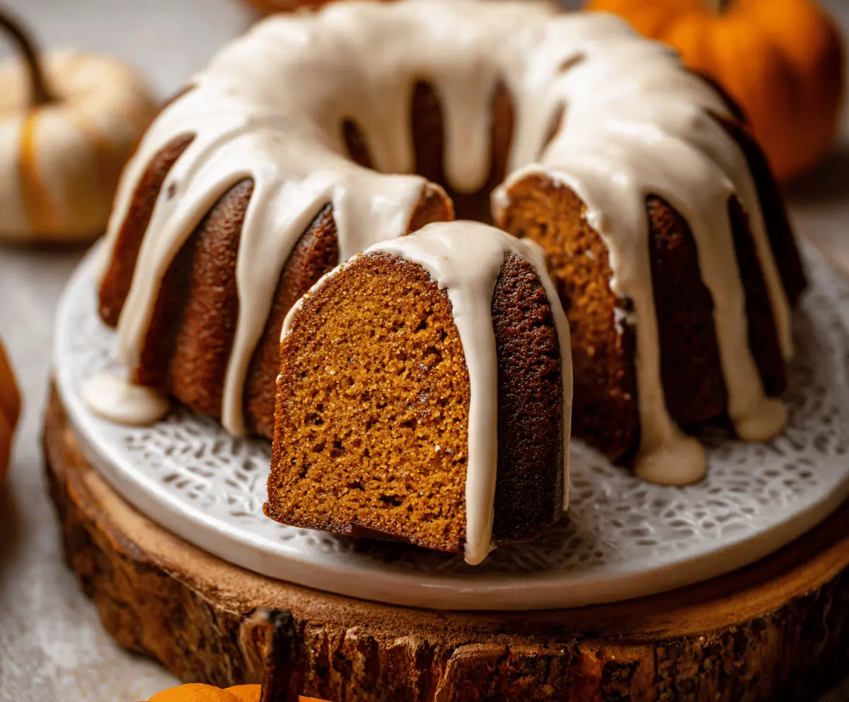 Slice your beautiful pumpkin bundt cake and serve! Enjoy every bit of this moist, spiced cake paired with the creamy glaze. It’s perfect for family gatherings or cozy afternoons at home!