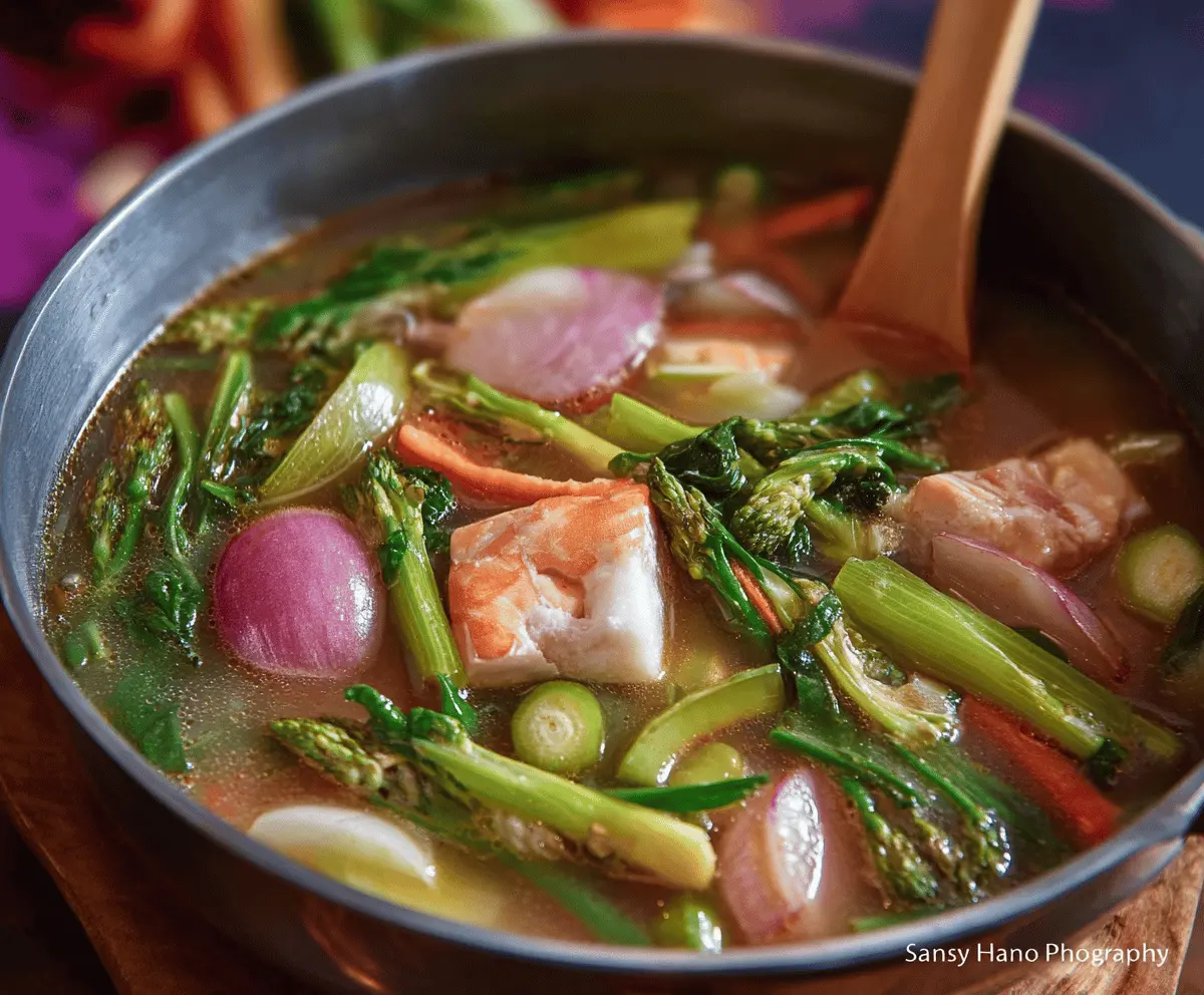 Traditional Filipino Sinigang soup with tender pork, fresh vegetables, and a tangy tamarind broth in a bowl
