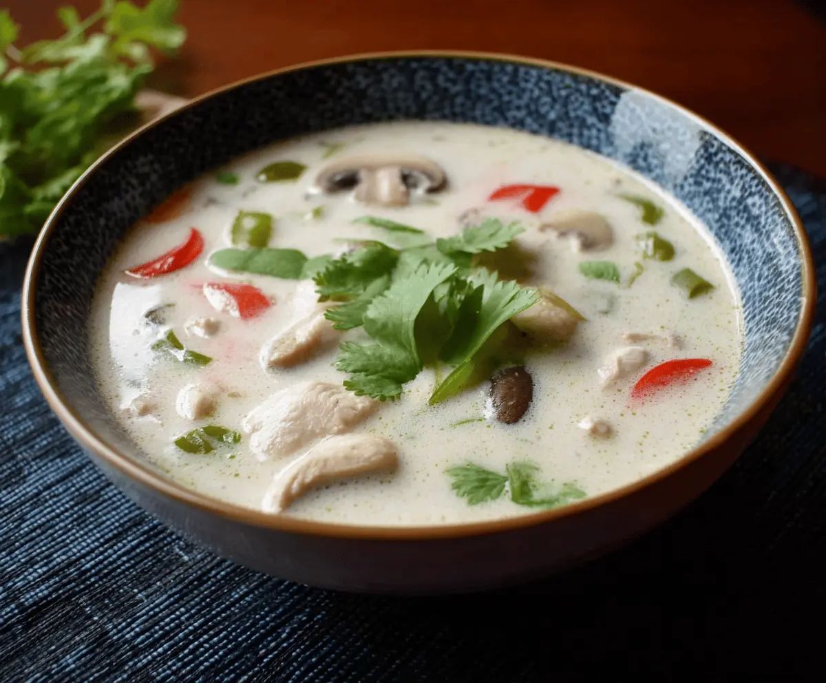 Serve your delicious Tom Kha Gai hot, garnished with fresh cilantro leaves. It pairs wonderfully with steamed jasmine rice for a complete meal!